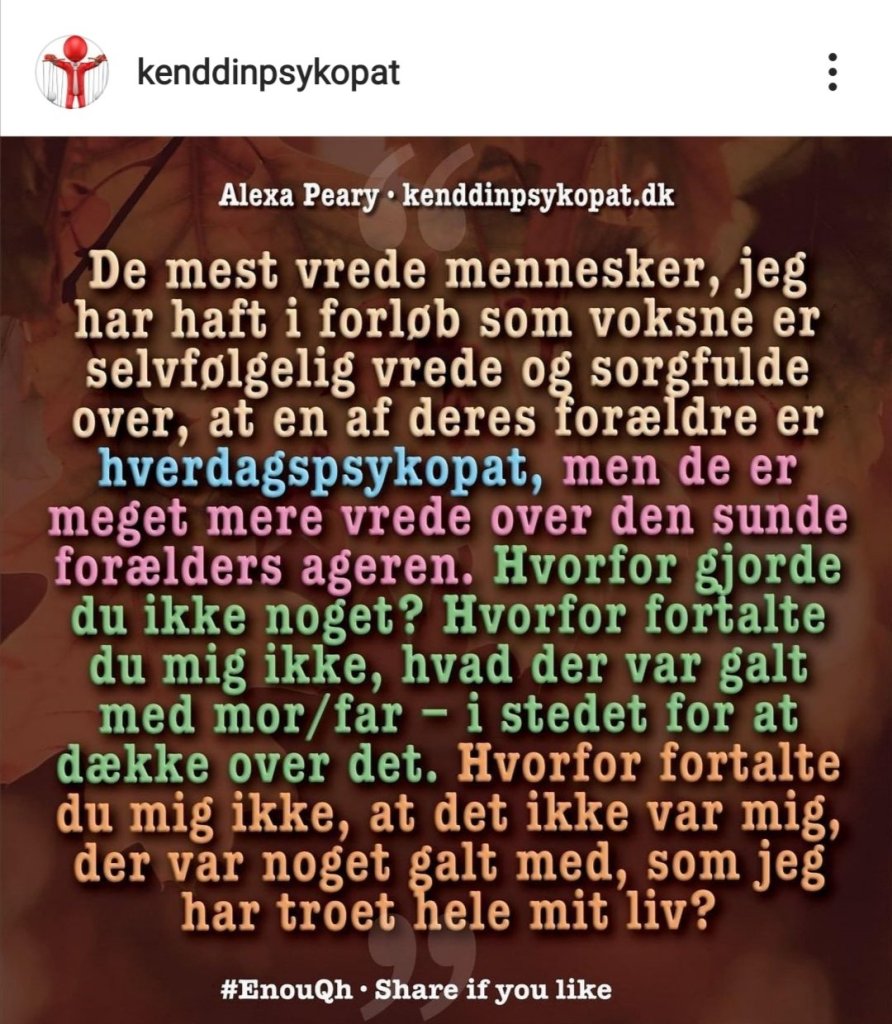 Jeg blir rigtig ked af det, nĂ„r jeg lĂŠser dette indlĂŠg igennem og det fĂ„r mig til at grĂŠde, for jeg undrer mig over hvorfor min mor gjorde som hun gjorde. Hvad havde jeg gjort, siden jeg fortjente at blive behandlet pĂ„ den mĂ„de? Hun fortalte mig jo at hun havde svĂŠrt ved at blive gravid og ‘stod pĂ„ hovedet’ for at blive gravid med mig, at hun tabte et barn fĂžr mig og et eller to efter mig, sĂ„ jeg fik tidligt ideen om at jeg var et rigtigt Ăžnskebarn, ind i hovedet, men i bakspejlet fĂžles det bare ikke sĂ„dan. Hun Ăžnskede sig ikke et barn. Hun Ăžnskede sig en dukke, som hun kunne pĂ„virke og fĂ„ til at gĂžre som hun gerne ville. Det er ikke fair. Det er sgu ikke fair at jeg, som 44 Ă„rig, skal kĂŠmpe sĂ„ voldsomt for at lĂŠre hvordan man har sunde og normale relationer.